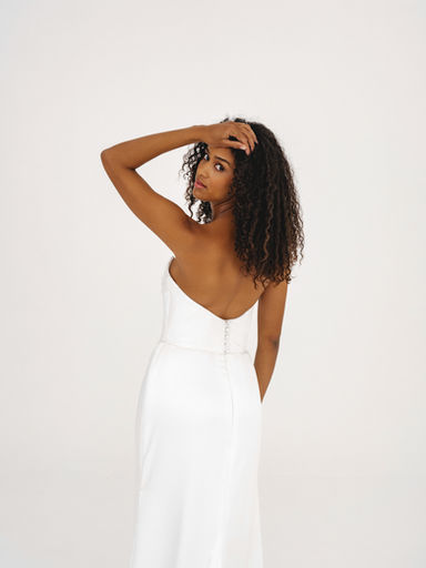 Lulu by Love Story London is a gorgeous satin set, with the option of either an a-line skirt or a fitted skirt with a strapless corset. The corset features a smile neckline and slight basque dip on the waistline.